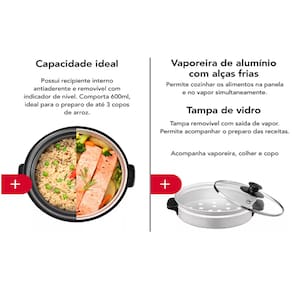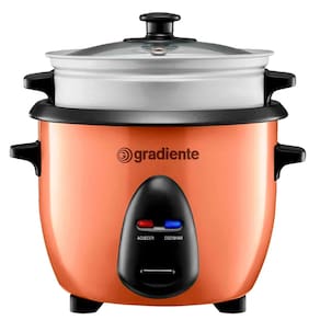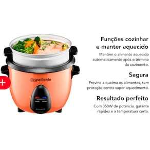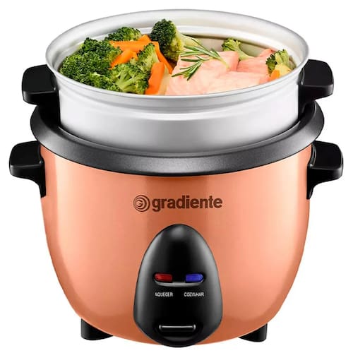 Panela elétrica multiuso Gradiente 3X1: risoteira, panela de arroz e vaporeira. Corpo em aço inox escovado com pintura cor cobre, capacidade de 600ml (3 copos de arroz), desligamento automático, função manter aquecido, acompanha colher e copo medidor.Lâmpada piloto