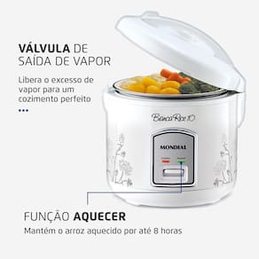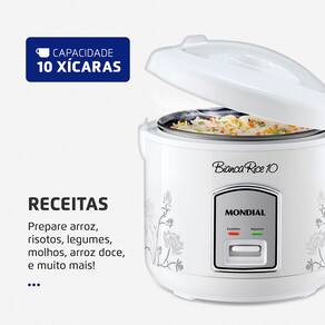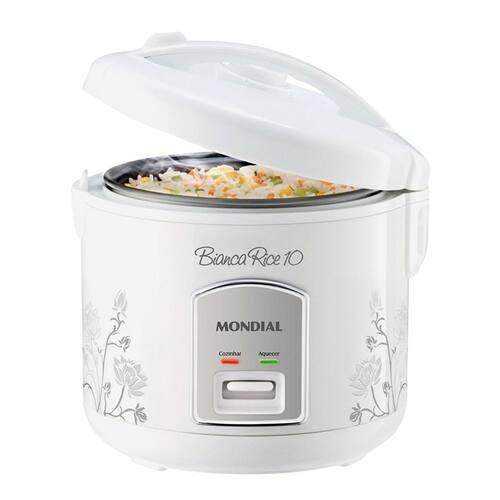 A Panela Eletrica Bianca Rice PE-10 da Mondial e a sua mais nova ?Melhor Amiga? na cozinha. Uma maneira bem mais pratica de preparar seu arroz e outras receitas - e torna-las ainda mais saborosas! Com a Bianca Rice seu arroz fica soltinho, e nao corre o risco de passar do ponto, pois ela e equipada com um termostato que nao deixa o alimento queimar, pois quando a agua seca completamente o sensor e ativado e a panela ira se desligar automaticamente e a funcao aquecer e ativada. Tudo isso sem que voce precise estar por perto. Confira!