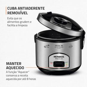 Com a Panela Elétrica Pratic 10i Premium Mondial você ganha tempo e eficiência no preparo das suas refeições. Possui capacidade para preparar até 10 xícaras de arroz e acompanha cesto que cozinha alimentos no vapor, preservando todos os nutrientes. Possui função aquecer, que mantém suas receitas quentinhas mesmo após terminar o preparo. Além disso, o design em inox garante sofisticação para sua cozinha.