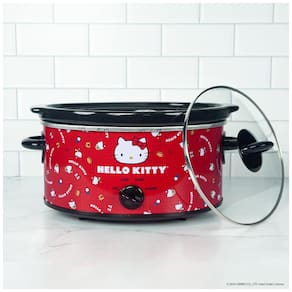 Transforme suas refeições com a encantadora panela elétrica de cozimento lento Hello Kitty! Com capacidade de 4,7 litros, essa panela é ideal para preparar pratos saborosos e ainda adiciona um toque adorável à sua cozinha. Sua estampa fofa, com itens de cozinha, gravatas-borboleta vermelhas e letras brancas, garante que você sorria cada vez que a usar.