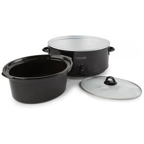Panela de cozimento lento com capacidade de 8 litros, configurações de cozimento em alta e baixa temperatura, e função 'Manter Aquecido'. Panela interna de cerâmica removível e tampa de vidro temperado seguras para lava-louças. Design em aço inoxidável polido com detalhes em preto.Lâmpada piloto