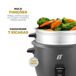 Prepare refeições completas e deliciosas com mais praticidade. Seja um arroz soltinho no ponto, um legume no vapor fresquinho ou um refogado saboroso, a Panela Elétrica Multifuncional Britânia 7 xícaras 500W BPA07 faz tudo isso e muito mais.