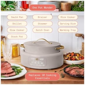 Panela elétrica multiuso 10 em 1 da linha Beautiful by Drew Barrymore com capacidade de 5,7 litros, acabamento Porcini Taupe e painel digital com comandos por toque para preparo de diferentes tipos de receitas em um único equipamento. O aparelho combina funções de panela de pressão, panela lenta, sauté, cozimento de arroz, vapor e outros modos, permitindo ajustar tempo e temperatura conforme o tipo de preparo.