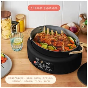 Panela elétrica multiuso 10 em 1 da linha Beautiful by Drew Barrymore com capacidade de 5,7 litros, acabamento Porcini Taupe e painel digital com comandos por toque para preparo de diferentes tipos de receitas em um único equipamento. O aparelho combina funções de panela de pressão, panela lenta, sauté, cozimento de arroz, vapor e outros modos, permitindo ajustar tempo e temperatura conforme o tipo de preparo.