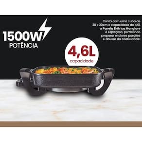 Panela Elétrica Mangiare 30cm 220V 1500W Quadrada Agratto A Panela Elétrica Mangiare Agratto é a grande aliada para quem busca uma alimentação saudável. A panela conta com revestimento antiaderente em sua Cuba, proporcionando assim alimentos saborosos sem adição de óleo. Multifunções, praticidade e elegância. Prepare refeições para família toda. Desing moderno e capacidade de 4,6 litros. Com a Panela Elétrica Mangiare Agratto você pode cozinhar, assar, fritar, aquecer, gratinar e tostar seus alimentos. Use sua criatividade para criar receitas e explorar essas funções. Informações técnicas Marca: Agratto Modelo: APEQ01I PRETO Cor: Preta Voltagem: 220V Frequência: 60 Hz Potência: 1500 W Tipo de produto: Panela Elétrica Multifuncional quadrada Funções: Cozinhar, assar, fritar, aquecer, gratinar e tostar Sistema de cozedura: A vapor Capacidade de canecas: 15 Capacidade em volume: 4.6 L Material da cuba: Antiaderente Material da tampa: Vidro Temperado Quantidade de níveis de temperatura: 5 Com Desligamento automático: Não Com Função manter aquecido: Não Válvula de respiro para saída de vapor: Sim Cabo de energia removível: Sim Acessórios incluídos: Alças isotérmicas, tampa de vidro temperado, resistência removível Tomada: 3 pinos 10A Homologado: Inmetro Peso e medidas (aproximados) Medidas do produto: 19 x 31 x 43 cm (altura x largura x profundidade) Medidas do cabo de alimentação: 0,80 m Medidas de embalagem: 15 x 31 x 44 cm (altura x largura x comprimento) Peso: 2,24 Kg Itens inclusos: 1 Panela Elétrica Grill, 1 Tampa de Vidro, 1 Seletor de Temperatura, 1 Manual (português) Garantia do vendedor: 30 dias