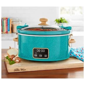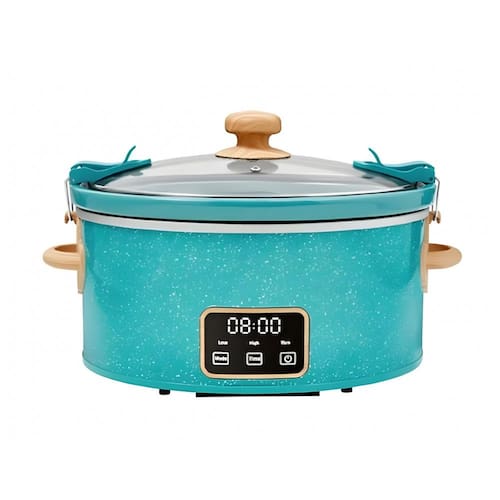 A panela elétrica slow cooker Pioneer Woman 6 litros com tampa travável foi projetada para preparo lento de refeições completas, mantendo temperatura constante ao longo de várias horas. O painel digital com controle por toque permite programar tempo e selecionar ajustes de aquecimento, facilitando o uso em rotinas domésticas com preparo antecipado.