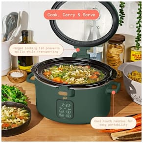 Panela elétrica Slow Cooker digital com cuba interna em cerâmica antiaderente e tampa de vidro temperado articulada. Painel digital com acionamento por toque para controle de tempo e temperatura. Função manter aquecido automática ao final do ciclo. Tampa com dobradiça e trava para transporte e redução de respingos.Lâmpada piloto