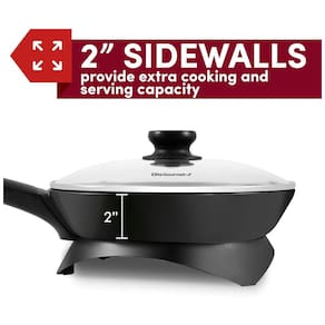 Expanda sua cozinha sem reformas. Um dos eletrodomésticos de cozinha pequenos mais versáteis e convenientes que você pode possuir é a Panela Elétrica Antiaderente Elite Gourmet. Prepare refeições em minutos, sele carnes antes de cozinhar e faça ovos em grande quantidade para sua família. Com revestimento de pedra de mármore antiaderente resistente e elemento de aquecimento embutido, a limpeza é fácil. Projetada para facilidade de uso e durabilidade, esta panela elétrica possui controle de temperatura variável de 93 a 204 graus Celsius, luz indicadora de energia e tampa de vidro temperado. As alças e botões são resfriados ao toque, e o bico de despejo integrado permite drenar sucos para molhos. Prepare refeições sem aquecer toda a cozinha de forma econômica. Nossa panela elétrica de qualidade conta com 1200 watts e é certificada pela ETL. Adquira hoje e simplifique sua rotina na cozinha! Segura para lava-louças e totalmente imersível para uma limpeza fácil e rápida. Corpo de alumínio fundido resistente com acabamento preto. O revestimento antiaderente marmorizado é mais durável que o convencional. Resistente a arranhões para cozinhar sem preocupações. Aquecimento uniforme e rápido graças ao elemento de aquecimento integrado. Mantenha sabores e umidade com a tampa de vidro. Diâmetro grande. Ideal para preparar refeições deliciosas. Inclui base com bico de despejo, termostato removível, tampa de vidro temperado e manual de instruções com receitas.