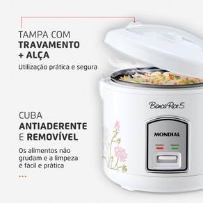 Produto: Panela eltrica de arroz 5 xcaras Bianca Rice - NPE-05-5X Marca: Mondial Voltagem: 110VDescrição: A Panela eltrica de arroz 5 xcaras Bianca Rice - NPE-05-5X da Mondial antiaderente, tem 400W, vem com livro de receitas e faz at 5 xcaras de arroz alm de outros doces e salgados como risotos, sopas, carnes e legumes. Quer saber o que vem na panela de arroz Esta panela eltrica acompanha um cesto cozi-vapor para cozinhar legumes e verduras no vapor, o que preserva vitaminas e deixa mais saudvel. Ela tambm vem com 1 colher especial, 1 copo medidor e 1 livro de receitas para voc cozinhar o que quiser de A a Z. Sua vlvula de sada de vapor libera o excesso de vapor durante o preparo, proporcionando cozimento perfeito. Alm disso, o coletor de vapor recolhe a gua acumulada durante o funcionamento, para voc no se molhar ao levantar a tampa. A cuba recipiente tem revestimento antiaderente: os alimentos no grudam e a faz mais prtica de lavar. Seus 400W de potncia ajudam voc a cozinhar mais. Caractersticas: • Capacidade para 5 xcaras: Faz at 5 xcaras de arroz e vrios tipos de alimentos doces e salgados como risoto, sopas, carnes e legumes • Vlvula de sada de vapor: Libera o excesso de vapor durante o preparo, proporcionando um cozimento perfeito • Preparo saudvel: Acompanha cesto cozi-vapor para cozinhar legumes e verduras no vapor, preservando as suas vitaminas • Praticidade e limpeza: Coletor de Vapor para recolher a gua condensada durante o funcionamento do produto. Cuba com revestimento antiaderente que facilita a limpeza • Acessrios: Acompanham colher, copo medidor e livro de receitas includo no manual .Especificações: Cor: BrancoTipo de panela: Panela Eltrica de ArrozMaterial: PPCapacidade: 5 xcarasPotncia: 400WRevestimento interno: SimAo do produto: Cozinhar, refogar e preparar alimentos de forma mais rpida.Luz indicadora: SimAcessrio para cozimento a vapor: SimColher e copo medidor: SimAlimentao: Energia Eltrica.Itens Inclusos: Colher, copo medidor e livro de receitas.