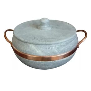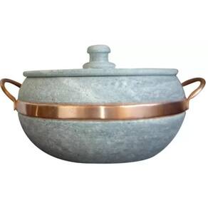 Medidas Número 5 (5 litros aproximadamente) MaterialPedra sabãoAlças em cobre Observação:* A panela precisa ser curada, processo este que é feito apenas uma vez, juntamente com a mercadoria irá um folheto explicativo. * Todo material em pedra sabão-após curado muda de cor ficando com uma tonalidade mais escura.* Fotos ilustrativas. Por ser artesanal as peças podem ter variações