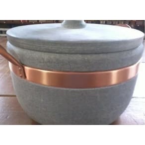 Ø Medidas Número 9 (9 litros aproximadamente) MaterialØ Pedra sabãoØ Alças em cobre Observação:* A panela precisa ser curada, processo este que é feito apenas uma vez, juntamente com a mercadoria irá um folheto explicativo. * Todo material em pedra sabão-após curado muda de cor ficando com uma tonalidade mais escura.* Fotos ilustrativas. Por ser artesanal as peças podem ter variações