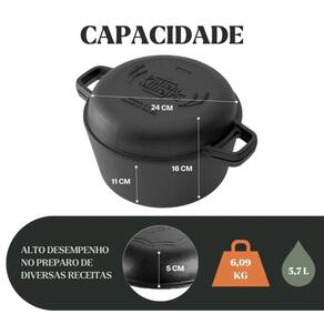 Possui uma caçarola com 4,0L e uma tampa (que também vira uma frigideira) com 1,7L - juntas elas totalizam 5,7L.Além de um design aperfeiçoado, com fundo reto e bordas alongadas, oferece excelente distribuição e retenção de calor, o que o torna ideal para o preparo de pães, bolos, carnes, arroz, bifes, frangos, peixes, vegetais e muito mais. Muito utilizado em redes de hotelaria, cozinhas industriais e gourmets.