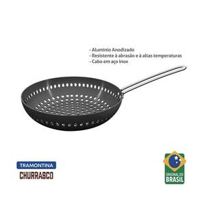 Panela Frigideira Grelha Wok Furada Tramontina Churrasco em alumínio anodizado com cabo em aço inox. Indicada para uso em churrasqueiras e ideal para grelhar legumes, peixes e petiscos, permitindo assim, que você sirva um churrasco com maior variedade de alimentos e com um preparo muito mais fácil. Seu material é resistente à abrasão e à altas temperaturas e seu cabo em aço inox irá lhe auxiliar no manuseio. A escolha perfeita para tornar o seu almoço em família, ainda mais gostoso e especial!
