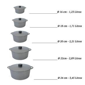 • 01 Panela C/ Tampa 16 cm – 1,23 Litros - Espessura do Alumínio: 2,5 mm 01 Panela C/ Tampa 18 cm – 1,71 Litros - Espessura do Alumínio: 2,5 mm 01 Panela C/ Tampa 20 cm – 2,21 Litros - Espessura do Alumínio: 2,7 mm 01 Panela C/ Tampa 22 cm – 2,89 Litros - Espessura do Alumínio: 2,8 mm 01 Panela C/ Tampa 24 cm – 3,45 Litros - Espessura do Alumínio: 3,0 mm