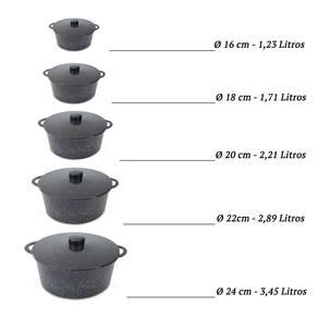 - 01 Panela C/ Tampa 16 cm 1,23 Litros - Espessura do Alumínio: 2,5 mm 01 Panela C/ Tampa 18 cm 1,71 Litros - Espessura do Alumínio: 2,5 mm 01 Panela C/ Tampa 20 cm 2,21 Litros - Espessura do Alumínio: 2,7 mm 01 Panela C/ Tampa 22 cm 2,89 Litros - Espessura do Alumínio: 2,8 mm 01 Panela C/ Tampa 24 cm 3,45 Litros - Espessura do Alumínio: 3,0 mm