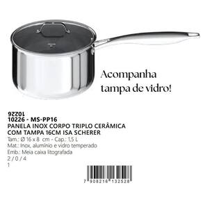 Panela inox 16cm antiaderente cerâmica tripla isa scherer Descrição do produto: Panela inox corpo triplo 16cm cerâmica isa scherer - mimo style A panela inox corpo triplo cerâmica com tampa 16cm da coleção isa scherer é a escolha perfeita para quem valoriza alta qualidade e eficiência na cozinha. Desenvolvida em parceria com a chef isa scherer, esta panela reúne design moderno e tecnologia avançada, proporcionando uma experiência culinária diferenciada e prática. Destaques do produto: - revestimento interno cerâmico antiaderente ppg fusionr hr: livre de ptfe e pfas, seu formato de colmeia facilita a limpeza, oferecendo resistência superior a riscos de utensílios de cozinha. - corpo triplo em aço inox: garante distribuição uniforme do calor, acelerando o cozimento e mantendo os alimentos aquecidos por mais tempo. - compatível com todos os fogões: funciona em fogões a gás, elétricos e de indução, além de poder ser levada ao forno, oferecendo praticidade e versatilidade para preparar e servir. Especificações técnicas: - diâmetro: 16 cm - altura: 8 cm - capacidade: 1,5 litros - material: aço inox corpo triplo com revestimento cerâmico em colmeia Benefícios adicionais: - assinatura isa scherer: inspirada pela chef e vencedora do masterchef 2021, esta linha de utensílios oferece sofisticação e praticidade para sua cozinha. - tecnologia antirrisco: a micromalha em aço inox protege o antiaderente, tornando a panela resistente a arranhões e fácil de limpar, ideal para o uso diário. 1. Posso usar a panela no forno Sim, ela é compatível com uso no forno, ampliando suas possibilidades de preparo. 2. O revestimento é seguro Sim, o revestimento cerâmico é livre de ptfe e pfas, sendo uma escolha segura e ecologicamente correta. 3. Funciona em fogão de indução Sim, a panela é compatível com todos os tipos de fogão, incluindo indução. 4. O produto tem Sim, nossos produtos possuem . O período de varia de acordo com o fabricante e o tipo de produto. Consulte a descrição do produto para mais informações. 5. O produto é novo ou 6. Posso rastrear meu pedido Sim, após a confirmação da compra,a própria plataforma fornecerá todos os dados de rastreamento para acompanhar a entrega do seu pedido. 7. Posso retirar o produto em algum lugar Atualmente, não oferecemos a opção de retirada em local físico. Todos os nossos produtos são entregues diretamente na sua casa. Transforme sua rotina culinária com a panela inox 16cm isa scherer e garanta mais qualidade e praticidade em cada receita Marca: Não Informado