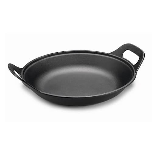 Panela Mineira Risoto Preta Alça de Ferro Fundido 36cm 5L A Panela Risoto Preta Alça de Ferro da Panela Mineira é um produto moderno, prático e eficiente, que apresenta alto desempenho no preparo de diversas receitas. O calor distribuído por toda a superfície faz com que o alimento cozinhe de maneira uniforme, conservando suas propriedades e nutrientes. Possui um design elegante, com base oval e bordas alongadas, o que a torna excelente para grelhar, fritar, cozinhar e, principalmente, servir. Ideal para risotos, peixadas, carnes, ensopados e muito mais. Onde usar: Pode ser utilizada em fogões a gás, a lenha, elétricos, cooktops de indução, vitro-cerâmicos, fornos, grills, churrasqueiras e fogo de chão. Como é feito em ferro fundido, aconselha a utilizar luva térmica ou pano. Orientação de Uso e Conservação:Antes do primeiro uso: Lave com água e sabão, seque bem com um pano e leve ao fogo para remover toda a umidade. Já vem pronta para uso, então não precisa ser curada. Guarde em um local seco. Após cada uso: Lave com água e sabão, usando uma esponja ou escova para remover todos os resíduos de alimentos. Se restarem resíduos, ferva água com um pouco de detergente para soltá-los. Pintura: Revestimento atóxico que garante durabilidade e proteção prolongada, sem causar nenhum dano à saúde. Características Técnicas e Medidas: Material: Ferro Fundido.Alças: Alça de Ferro.Modelo: Redondo.Diâmetro: 36cm.Litragem: 5L.Altura: 8cm.Linha: CHEF.Peso: 5,9Kg. Itens Inclusos: 01 Panela Risoto Preta Alça de Ferro Panela Mineira 36x8cm 5L. Código: 4046PMProdutoLojaPlast.