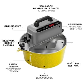 Regulador de velocidade digital com até 30 níveis, motor de 130W com sistema RED-Plus, fundo triplo e paredes extra grossas para melhor distribuição de calor, espátulas de silicone resistentes ao calor, temporizador digital, suporte para virar doces e massas.Lâmpada piloto