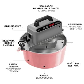Regulador de velocidade digital com até 30 níveis, motor de 130W com sistema RED-Plus, fundo triplo e paredes extra grossas para melhor distribuição de calor, carenagem em ABS de alta resistência, espátulas de silicone resistentes ao calor, temporizador digital, suporte para virar doces e massas, produto certificado pelo INMETRO.Lâmpada piloto