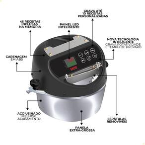 - Com capacidade de 4L, inox resistente e painel digital, ela mistura e cozinha automaticamente, sem que você precise mexer.
