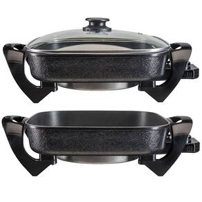 Panela elétrica multifuncional quadrada com 5 níveis de temperatura, Cuba antiaderente, Tampa de vidro temperado, Cabo de energia removível, Alças isotérmicas, Seletor de temperatura removível.Lâmpada piloto