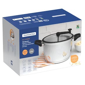 Prepare suas pipocas com eficiência e estilo usando a pipoqueira Tramontina Allegra em aço inox com fundo triplo e tampa de vidro com borda de silicone, 22 cm e capacidade de 5,6 L. Produzida em aço inox de alta qualidade, ela garante aquecimento rápido e uniforme, sendo ideal para fogões de indução e demais tipos. A tampa de vidro temperado permite acompanhar o preparo sem abrir a panela, mantendo o calor e a eficiência. A borda de silicone e a saída de vapor evitam que as pipocas fiquem úmidas, garantindo crocância em cada grão.