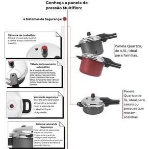 descrição: comparada a panelas de pressão comuns, a panela de pressão quartzo pode reduzir o tempo de cozimento pela metade, o que representa grande economia de tempo e energia para você. As panelas de pressão multiflon foram desenvolvidas para agilizar o preparo de alimentos que requerem um maior tempo de cozimento. Além de oferecer praticidade para o usuário, este tipo de produto deve oferecer também segurança. Para garantir isso, a multiflon somente coloca no mercado produtos que atendem a todas as normas em vigor e que foram devidamente certificados pelo inmetro. Medidas: -capacidade: 3,0l; -diâmetro: 20cm; -altura: 17,05cm; -altura bojo: 10,70cm; -comprimento até o cabo: 39,85cm. Tecnologia: -resultado de anos de pesquisa e experimentações, a tecnologia quartzo inova pela extrema resistência e durabilidade. -isso significa que o revestimento apresenta alta espessura, garantindo extra resistência à abrasão e alta performance antiaderente. -o revestimento quartzo é altamente antiaderente e livre de pfoa. Características: -fogão a gás, elétrico e vitrocerâmico; -antiaderente multiflon quartzo; -cabo em baquelite resistente a altas temperaturas; -tampa em alumínio polido; -válvula de travamento automático,válvula de trabalho e válvula de segurança; -sistema lateral de segurança; -atóxico; -pode ir ao lava louças; -alúminio de alta qualidade; -pode ir ao refrigerador; -pfoa free. Cuidados: -lavar com esponja macia e detergente neutro; -não pode ser utilizado no microondas.