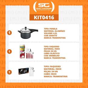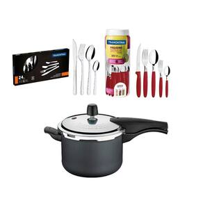 Componentes do kit: - 1 panela 4,5 vancouver grafite -tramontina - 1 faqueiro vermelho 30pç - tramontina - 1 faqueiro inox buzios 24pç tramontina Panela pressão 4,5 lts antiaderente tramontina vancouver Descrição ficha técnica: Modelo vancouver starflon Cód. 20582/620 grafite Cód. 20582/720 vermelha - eficiente e segura. - produzida em alumínio com revestimento interno e externo antiaderente starflon t1 - tampa em alumínio com acabamento externo polido e interno satinado tampa não é antiaderente . - alças e cabo superior e inferior em baquelite. - sitema de segurança lateral. - válvula de segurança. - válvula de trabalho alívio . - revestimento antiaderente starflon. - maior resistência a desgaste por fricção, raspagem. - pode cozinhar em fogão a gás, elétrico e também vitrocerâmico. - fácil manuseio e limpeza. - capacidade 4,5l. - 1 unidade por embalagem. - 3 sistemas de segurança 1 cabo e 2 na tampa Peso líquido: 1,6 kg Peso bruto: 1,75 kg Medidas internas panela : 19,5cm diâmetro x 14,5 alt. verifique o nível máxima informado no interior panela Medida externa: 22,9cm a x 40,8cm l x 23,1 p Faqueiro facas talheres ipanema vermelho 30pç tramontina 23398/788 Descrição ficha técnica: Modelo ipanema 30 peças. Cód. 23398/788 cor vermelho. Uso seguro e adequado: - antes da primeira utilização, lave bem as peças e seque-as. - produtos cortantes e perfurantes, tenha cuidado e mantenha sempre fora do alcance das crianças. - para maior durabilidade dos produtos, recomenda-se secar bem antes de guardar, mesmo após lavagem em máquinas. - para descarte dos produtos e embalagem, siga as orientações de reciclagem vigentes. Conteúdo: 6 facas lâmina 11,2cm - medida 21cm 6 garfos de mesa. - medida 19cm 6 colheres de mesa. - medida 19cm 6 garfos para sobremesa. - medida 14cm 6 colheres para chá. - medida 14cm - lâmina em aço inox, maior resistência a desgaste por fricção, raspagem. - fácil manuseio e limpeza. - 30 pçs por embalagem. Peso líquido: 0,95 kg Peso bruto: 1,05 kg Faqueiro facas talheres buzios 24pç tramontina 23799/071 Descrição ficha técnica: Modelo buzios 24 peças. Cód. 23799/071 inox. Uso seguro e adequado: - antes da primeira utilização, lave bem as peças e seque-as. - produtos cortantes e perfurantes, tenha cuidado e mantenha sempre fora de alcance das crianças. - para maior durabilidade dos produtos, recomenda-se secar bem antes de guardar, mesmo após lavagem em máquinas. - para descarte dos produtos e embalagem, siga as orientações de reciclagem vigentes. Conteúdo: 6 facas churrasco lâmina serrilhada 10,6cm - medida total 20,8cm 6 garfos de mesa. - medida total 19cm 6 colheres de mesa. - medida total 19cm 6 colheres para chá. - medida total 13cm - lâmina em aço inox, maior resistência a desgaste por fricção, raspagem. - fácil manuseio e limpeza. - 24 pç por embalagem. Peso líquido: 0,8 kg Peso bruto: 0,95 kg Especificação da embalagem do kit: Peso bruto: 3,75 Medida da embalagem : 13 cm a 44,5 cm l 36 cm p