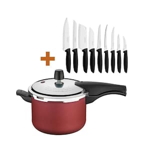 Componentes do kit:- 1 panela 4,5 vancouver vermelho -tramontina- 1 conjunto facas 9pç - tramontina- não indicado para fogão indução.Panela pressão 4,5 lts antiaderente tramontina vancouverdescrição ficha técnica:modelo vancouver starfloncód. 20582/620 grafitecód. 20582/720 vermelhaeficiente e segura.Produzida em alumínio com revestimento interno e externo em antiaderente starflon t1tampa em aluminio com acabamento externo polido e interno satinado tampa não é antiaderente .Alças e cabo superior e inferior em baquelite.Sitema de segurança lateral.Válvula de segurança.Válvula de trabalho alívio .- revestimento antiaderente starflon.- maior resistência á desgaste por fricção, raspagem.- pode cozinhar fogão gás, elétrico e também vitrocerâmico.- fácil manuseio e limpeza.- capacidade 4,5l.- 1 unidade por embalagem.- 3 sistema de segurança 1 cabo e 2 na tampa. peso líquido: 1,6 kgpeso bruto: 1,75 kgmedidas internas panela : 19,5cm diâmetro x 14,5 alt. verifique o nivel máxima informado no interior panela medida externa: 22,9cm a x 40,8cm l x 23,1 p - mais detalhes, na foto do anuncio .Jogo de facas plenus 9pç tramontina 23498/048faca e garfo.Descrição ficha técnica:modelo plenus 9 peças.Cód. 23498/048 cor preta.Uso seguro e adequado:- antes da primeira utilização, lave bem as peças e seque-as.- produto cortants e perfurantes, tenha cuidado e mantenha sempre fora de alcance das crianças.- para maior durabilidade dos produtos, recomenda-se secar bem antes de gaurar, mesmo após lavagem em máquinas.- para descarte dos produtos e embalagem, sega as orientações de reciclagem vigente.Conteudo:1 faca lâmina 7,6cm para tornear torneia, descasca e esculpe frutas e verduras .1 faca lâmina 7,6cm para legumes ideal cortar, descascar e fazer cortes delicados .1 faca lâmina 12,7cm para churrasco e frutas com fio serrilhado para corte de carne cozidas e frutas. Não necessita reafiação .1 faca lâmina 12,7cm para tomates a lâmina microserrilhada rompe e pela do tomate sem amassar 1 faca lâmina 12,7cm para dessosa ideal para separar a carne dos ossos e tirar a gordura .1 faca lâmina 12,7cm santoku ideal para cortar, fatiar e picar .1 faca lâmina 17,8cm pão a lâmina serrilhada corta sem amassar .1 faca lâmina 17,8cm chef toda versatilidade da protagonista da cozinha .1 faca lâmina 12,7cm cutelo ideal para quebrar e separar os ossos .- lâmina em aço inox ,maior resistência á desgaste por fricção, raspagem.- fácil manuseio e limpeza sempre cuidando com navalha e pontas .- 9 facas por embalagem.Peso líquido: 1,5 kgpeso bruto: 1,65 kgexpecificação da embalagem do kit:peso bruto: 3,4kgmedida embalagem: 23cm alt x 39cm l x 43cm p.