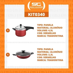 Componentes do kit:- 1 panela 4,5 vancouver vermelha -tramontina - 1 panela wok 28cm - tramontina- não indicado para fogão indução.Panela pressão 4,5 lts antiaderente tramontina vancouver descrição ficha técnica:modelo vancouver starfloncód. 20582/620 grafitecód. 20582/720 vermelha eficiente e segura.Produzida em alumínio com revestimento interno e externo em antiaderente starflon t1tampa em aluminio com acabamento externo polido e interno satinado tampa não é antiaderente .Alças e cabo superior e inferior em baquelite.Sitema de segurança lateral.Válvula de segurança.Válvula de trabalho alívio .- revestimento antiaderente starflon.- maior resistência á desgaste por fricção, raspagem.- pode cozinhar fogão gás, elétrico e também vitrocerâmico.- fácil manuseio e limpeza.- capacidade 4,5l.- 1 unidade por embalagem.- 3 sistema de segurança 1 cabo e 2 na tampa peso líquido: 1,6 kgpeso bruto: 1,75 kgmedidas internas panela : 19,5cm diâmetro x 14,5 alt. verifique o nivel máxima informado no interior panela medida externa: 22,9cm a x 40,8cm l x 23,1 p - mais detalhes, na foto do anuncio .Panela 28cm wok loreto aluminio antiaderente tramontina 27817/022 descrição ficha técnica:produzida em alumínio com revestimento interno em antiaderente starflon t1tampa em vidro tamperado com saída de vapor e borda de aço inox.Alças de baquelite e pegador de nylon.- modelo wok loreto 28cm.- corpo em aluminio reforçado.1,8mm. - revestimento antiaderente starflon.- maior resistência á desgaste por fricção, raspagem.- pode cozinhar fogão gás, elétrico e também vitrocerâmico.- fácil manuseio e limpeza.- capacidade 3,3 l.- 1 unidade por embalagem.- pode lavar em máquina.Peso líquido: 1,3 kgpeso bruto: 1,45 kgmedida externa: 13cm a x 40,9cm l 29,4cm área cuba . - mais detalhes, na foto do anuncio .Expecificação da embalagem do kit:peso bruto: 3,2kg medida embalagem: 30cm alt x 30cm l x 39cm p.Perguntas frequentes:- produto novoSim, , lacrado e de fábrica.- qual a garantiaGarantia é de 12 meses contra defeito de fábricação.- quantos litros3,3 l - diâmetro de 28cm.Panela pressão 4,5 lts antiaderente tramontina vancouver.