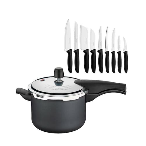 Componentes do kit:- 1 panela de pressão 4,5 vancouver grafite - tramontina- 1 conjunto facas 9pç - tramontina- não indicado para fogão indução.Panela pressão 4,5 lts antiaderente tramontina vancouverdescrição ficha técnica:modelo vancouver starfloncód. 20582/620 grafitecód. 20582/720 vermelhaeficiente e segura.Produzida em alumínio com revestimento interno e externo em antiaderente starflon t1tampa em aluminio com acabamento externo polido e interno satinado tampa não é antiaderente .Alças e cabo superior e inferior em baquelite.Sitema de segurança lateral.Válvula de segurança.Válvula de trabalho alívio de pressão .- revestimento antiaderente starflon.- maior resistência á desgaste por fricção, raspagem.- pode cozinhar fogão gás, elétrico e também vitrocerâmico.- fácil manuseio e limpeza.- capacidade 4,5l.- 1 unidade por embalagem.- 3 sistema de segurança 1 cabo e 2 na tampa. peso líquido: 1,6 kgpeso bruto: 1,75 kgmedidas internas panela : 19,5cm diâmetro x 14,5 alt. verifique o nivel máxima informado no interior panela medida externa: 22,9cm a x 40,8cm l x 23,1 p - mais detalhes, na foto do anuncio .Jogo de facas plenus 9pç tramontina 23498/048 faca e garfo.Descrição ficha técnica:modelo plenus 9 peças.Cód. 23498/048 cor preta.Uso seguro e adequado:- antes da primeira utilização, lave bem as peças e seque-as.- produto cortants e perfurantes, tenha cuidado e mantenha sempre fora de alcance das crianças.- para maior durabilidade dos produtos, recomenda-se secar bem antes de gaurar, mesmo após lavagem em máquinas.- para descarte dos produtos e embalagem, sega as orientações de reciclagem vigente.Conteudo:1 faca lâmina 7,6cm para tornear torneia, descasca e esculpe frutas e verduras .1 faca lâmina 7,6cm para legumes ideal cortar, descascar e fazer cortes delicados .1 faca lâmina 12,7cm para churrasco e frutas com fio serrilhado para corte de carne cozidas e frutas. Não necessita reafiação.1 faca lâmina 12,7cm para tomates a lâmina microserrilhada rompe e pela do tomate sem amassar 1 faca lâmina 12,7cm para dessosa ideal para separar a carne dos ossos e tirar a gordura .1 faca lâmina 12,7cm santoku ideal para cortar, fatiar e picar.1 faca lâmina 17,8cm pão a lâmina serrilhada corta sem amassar .1 faca lâmina 17,8cm chef toda versatilidade da protagonista da cozinha .1 faca lâmina 12,7cm cutelo ideal para quebrar e separar os ossos .- lâmina em aço inox ,maior resistência á desgaste por fricção, raspagem.- fácil manuseio e limpeza sempre cuidando com navalha e pontas .- 9 facas por embalagem.Peso líquido: 1,5 kgpeso bruto: 1,65 kg expecificação da embalagem do kit:peso bruto: 3,4 kgmedida embalagem: 23cm alt x 39cm l x 43cm p.