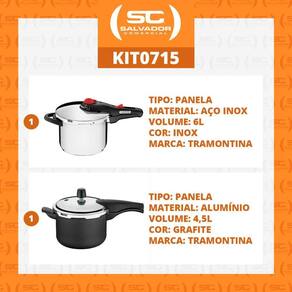 Componentes do KIT: 1 - Panela com Fundo Triplo em Aço Inox 22 cm 6 L - Solar - Tramontina 1 - Panela Pressão 4,5 Lts antiaderente Tramontina Vancouver Panela 6L Solar Cód. 62516223 - Mais praticidade e qualidade na sua cozinha - Produzida em aço inox - Pode ser utilizada em fogão a gás, elétrico, vitrocerâmico ou por indução - Cabo e alça antitérmicos - Fundo triplo: aço inox, alumínio, aço inox - Distribuição de calor uniforme, cozimento rápido e economia de energia - Alimentos aquecidos por mais tempo - Sistema de descompressão - Medidor de capacidade interno - 5 dispositivos de segurança - Capacidade mínima: 250ml de líquido 1/4 litro - Capacidade máxima: 2/3 da capacidade total da panela alimento + líquido - Atestada pela Norma Nacional de Segurança/INMETRO - Acompanha manual de instruções Capacidade da panela: 6 litros Pressão de trabalho: 80/95 kPa Peso líquido: 3,06 kg Peso bruto: 3,85 kg Medidas do produto: 23,1cm A x 24,7cm L x 45cm P Diâmetro da panela: 22cm Medidas da embalagem: 25,4cm A x 27,2cm L x 44,1cm P de 2 anos contra defeito de fabricação. Panela Pressão 4,5L Vancouver - NÃO indicado para fogão Indução. Característica e Descrição Ficha Técnica: - Modelo Vancouver Starflon Cód.20582/620 Grafite Cód.20582/720 Vermelha - Eficiente e Segura. - Produzida em alumínio com revestimento interno e externo em antiaderente Starflon T1 - Tampa em alumínio com acabamento externo polido e interno satinado tampa não é antiaderente . - Alças e cabo superior e inferior em baquelite. - Sitema de segurança lateral - Válvula de segurança - Válvula de trabalho alívio - Revestimento antiaderente StarFlon - Maior resistência á desgaste por fricção, raspagem - Pode cozinhar fogão gás, elétrico e também vitrocerâmico - Fácil manuseio e limpeza - Capacidade 4,5L - 1 Unidade por embalagem - 3 sistema de segurança 1 cabo e 2 na tampa - Medidas internas panela : 19,5cm diâmetro x 14,5 Alt. verifique o nível máxima informado no interior panela - Medida Externa: 22,9cm A x 40,8cm L x 23,1 P - mais detalhes, na foto do anuncio . - Medida Embalagem: 21 cm Alt x 39cm L x 23cm P. Medidas totais do kit: 47cm A x 45cm C x 28cm P Peso total do kit: 5,85 kg