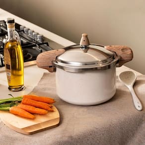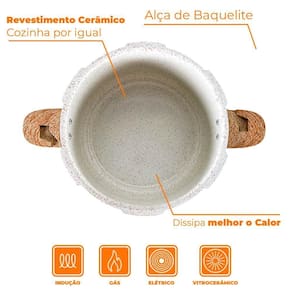 Panela Antiaderente Vanilla Brinox 5,4L Indução Ceramiclife Pressure 4953/103 Panela 5,4L Ceramiclife - Brinox A panela Ceramiclife conta com estrutura de alumínio com revestimento cerâmico que cozinha os alimentos por igual e mais rápido, dissipando melhor o calor, proporcionando um maior aproveitamento de nutrientes dos alimentos agora com exclusivo fundo de indução, que funciona em todos os tipos de fogões, para você passar menos tempo cozinhando e ter mais segurança durante os preparos. Além disso, suas paredes externas possuem pintura na cor Vanilla trazendo mais sofisticação para a sua cozinha. Seu cabo e alça de baquelite com revestimento soft touch em tons amadeirados proporcionam mais conforto e melhor manuseio, já que possuem toque macio e não esquentam. possui 2 anos de e 4 dispositivos de segurança uma trava, duas válvulas de trabalho e um escape de segurança . Medidas aproximadas: Capacidade: 5,4L Diâmetro: 22cm Altura: 15 cm Peso: 1,88Kg Orientações: Ao utilizar utensílios quentes tenha cuidado redobrado. Se necessário, utilize proteção para as mãos e mantenha fora do alcance de crianças. Para sua segurança, ao utilizar utensílios com cabos, mantenha os mesmos sempre voltados para o centro do fogão. Ao utilizar seu utensílio em fogões com grade, mantenha a peça centralizada e alinhe o cabo com a grade, para reduzir o risco de queda. Para descarte do produto e embalagem siga as orientações de reciclagem vigentes. Características: Marca: Brinox Referência: 4953/103 Material: Corpo de alumínio, Revestimento interno e externo de antiaderente Ceramiclife, Alças e cabos de baquelite com revestimento softtouch. Quantidade: 1 peça Cor: Vanilla Imagens Ilustrativas. Marca: Não Informado