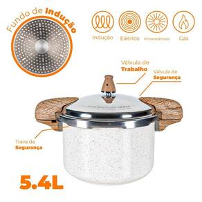 Panela Antiaderente Vanilla Brinox 5,4L Indução Ceramiclife Pressure 4953/103 Panela 5,4L Ceramiclife - Brinox A panela Ceramiclife conta com estrutura de alumínio com revestimento cerâmico que cozinha os alimentos por igual e mais rápido, dissipando melhor o calor, proporcionando um maior aproveitamento de nutrientes dos alimentos agora com exclusivo fundo de indução, que funciona em todos os tipos de fogões, para você passar menos tempo cozinhando e ter mais segurança durante os preparos. Além disso, suas paredes externas possuem pintura na cor Vanilla trazendo mais sofisticação para a sua cozinha. Seu cabo e alça de baquelite com revestimento soft touch em tons amadeirados proporcionam mais conforto e melhor manuseio, já que possuem toque macio e não esquentam. possui 2 anos de e 4 dispositivos de segurança uma trava, duas válvulas de trabalho e um escape de segurança . Medidas aproximadas: Capacidade: 5,4L Diâmetro: 22cm Altura: 15 cm Peso: 1,88Kg Orientações: Ao utilizar utensílios quentes tenha cuidado redobrado. Se necessário, utilize proteção para as mãos e mantenha fora do alcance de crianças. Para sua segurança, ao utilizar utensílios com cabos, mantenha os mesmos sempre voltados para o centro do fogão. Ao utilizar seu utensílio em fogões com grade, mantenha a peça centralizada e alinhe o cabo com a grade, para reduzir o risco de queda. Para descarte do produto e embalagem siga as orientações de reciclagem vigentes. Características: Marca: Brinox Referência: 4953/103 Material: Corpo de alumínio, Revestimento interno e externo de antiaderente Ceramiclife, Alças e cabos de baquelite com revestimento softtouch. Quantidade: 1 peça Cor: Vanilla Imagens Ilustrativas. Marca: Não Informado Ean: 7900161008873