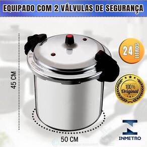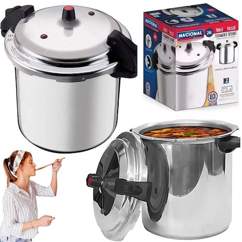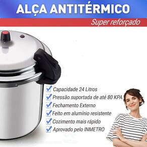 • Capacidade gigante: 24 Litros – perfeita para grandes receitas, eventos ou negócios. • Material Premium: Alumínio resistente que garante durabilidade e cozimento uniforme. • Fechamento externo seguro: Mais praticidade e menos esforço na hora de fechar. • 2 válvulas de segurança: Cozinhe tranquilo(a), com proteção reforçada contra pressão excessiva. • Alça antitérmica: Pegada firme e segura, sem risco de queimaduras. • Design robusto e funcional: Profissionalismo que salta aos olhos.