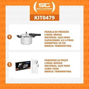 Componentes do kit:1 - panela com fundo triplo em aço inox 20 cm 4,5 l - brava - tramontina cód. 62416200- mais praticidade e qualidade na sua cozinha- produzida em aço inox- pode ser utilizada em fogão a gás, elétrico, vitrocerâmico ou por indução- cabo e alça antitérmicos- fundo triplo: aço inox, alumínio, aço inox- distribuição de calor uniforme, cozimento rápido e economia de energia- alimentos aquecidos por mais tempo- sistema de descompressão- medidor de capacidade interno- 5 dispositivos de segurança- capacidade mínima: 250ml de líquido 1/4 litro - capacidade máxima: 2/3 da capacidade total da panela alimento + líquido - atestada pela norma nacional de segurança / inmetro- acompanha manual de instruçõescapacidade da panela: 4.5 litrospressão de trabalho: 80kpapeso líquido: 2,34 kgpeso bruto: 2,64 kgmedidas do produto:21cm a x 22,7cm l x 42,7cm pdiâmetro da panela:20cm1 - faqueiro facas talheres búzios 24pç tramontina 23799/071faca e garfo.Característica e descrição ficha técnica:- modelo búzios 24 peças.Cód. 23799/071 inox.Uso seguro e adequado:- antes da primeira utilização, lave bem as peças e seque-as.- produto cortantes e perfurantes, tenha cuidado e mantenha sempre fora de alcance das crianças.- para maior durabilidade dos produtos, recomenda-se secar bem antes de guardar, mesmo após lavagem em máquinas.- para descarte dos produtos e embalagem, siga as orientações de reciclagem vigentes.Conteúdo:- 6 faca churrasco lâmina serrilhada 10,6cm - medida total 20,8cm- 6 garfos de mesa - medida total 19cm- 6 colheres de mesa - medida total 19cm- 6 colheres para chá - medida total 13cm- lâmina em aço inox ,maior resistência á desgaste por fricção, raspagem.- fácil manuseio e limpeza sempre cuidando com navalha e pontas .- 24 pç por embalagem.- peso líquido: 0,8 kg- peso bruto: 0,95 kgespecificação da embalagem do kit:peso bruto: 3,65 kgmedida embalagem: 25cm a x 45cm l x 41cm p. Marca: Não Informado