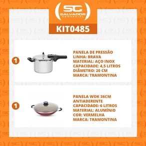Componentes do kit:1 - panela com fundo triplo em aço inox 20 cm 4,5 l - brava - tramontina cód. 62416200- mais praticidade e qualidade na sua cozinha- produzida em aço inox- pode ser utilizada em fogão a gás, elétrico, vitrocerâmico ou por indução- cabo e alça antitérmicos- fundo triplo: aço inox, alumínio, aço inox- distribuição de calor uniforme, cozimento rápido e economia de energia- alimentos aquecidos por mais tempo- sistema de descompressão- medidor de capacidade interno- 5 dispositivos de segurança- capacidade mínima: 250ml de líquido 1/4 litro - capacidade máxima: 2/3 da capacidade total da panela alimento + líquido - atestada pela norma nacional de segurança / inmetro- acompanha manual de instruçõescapacidade da panela: 4.5 litrospressão de trabalho: 80kpapeso líquido: 2,34 kgpeso bruto: 2,64 kgmedidas do produto:21cm a x 22,7cm l x 42,7cm pdiâmetro da panela:20cm1 - panela 36cm wok paris aluminio antiaderente tramontina 20545/736descrição ficha técnica:- não indicado para fogão indução.Produzida em alumínio com revestimento interno em antiaderente starflon t1tampa em vidro tamperado com saída de vapor e borda de aço inóx.Alças em aço inox com proteção de baquelite antitérmico e pagador de nylon.- modelo wok paris 36cm. - não indicado para fogão indução.- corpo em aluminio reforçado.1,8mm. - revestimento antiaderente starflon.- maior resistência á desgaste por fricção, raspagem.- pode cozinhar fogão gás, elétrico e também vitrocerâmico.- fácil manuseio e limpeza.- capacidade 6 l.- 1 unidade por embalagem.- pode lavar em máquina.Peso líquido: 1,8 kgpeso bruto: 1,95 kgespecificação da embalagem do kit:peso bruto: 4,65 kgmedida embalagem: 34cm a x 37cm l x 41cm p. Marca: Não Informado