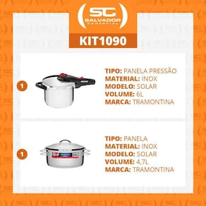 Componentes do kit:- 01 panela com fundo triplo em aço inox 22 cm 6 l - solar - tramontina cód. 62516223- 01 panela aço inox com fundo triplo solar pit 1 cód. 65510830 solardescrição e caracteristica da ficha técnica:- panela com fundo triplo em aço inox 22 cm 6 l - solar - tramontina cód. 62516223- pode ser utilizada em fogão a gás, elétrico, vitrocerâmico ou por indução- cabo e alça antitérmicos- fundo triplo: aço inox, alumínio, aço inox- 5 dispositivos de segurança- capacidade mínima: 250ml de líquido 1/4 litro - capacidade máxima: 2/3 da capacidade total da panela alimento + líquido - capacidade da panela: 6 litros- pressão de trabalho: 80/95 kpa- peso líquido: 3,06 kg- peso bruto: 3,85 kg- diâmetro da panela: 22cm- medidas da embalagem: 25,4cm a x 27,2cm l x 44,1cm p- medidas do produto: 23,1cm a x 24,7cm l x 45cm p- de 2 anos contra defeito de fabricação. Panela aço inox com fundo triplo solar pit 1 cód. 65510830 solar- totalmente feitas em aço inox.- o fundo triplo aço inox + alumínio + aço inox .- podem ir ao forno para gratinar ou finalizar pratos, na temperatura máxima de 260c.- podem ser utilizadas nos fogões: gás, elétrico, vitrocerâmico e indução.- : 25 anos 90 dias de legal, acrescidos de 24 anos e 09 meses de contratual para vícios ou defeitos de fabricação- pit 1 - 62503240 diâmetro - 24cm 4,7l espessura: 0,7mm ean: 7891116000960- peso bruto: 2,09 kg- medida embalagem: 13 cm alt x 35 cm l x 38 cm p. Marca: Não Informado