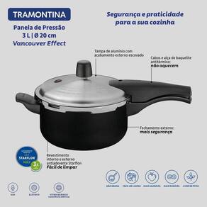 Detalhes do produto Para quem busca eficiência e estilo na cozinha, a panela Tramontina Vancouver em alumínio com revestimento interno e externo antiaderente Starflon Max preto 20 cm e 3 litros é a escolha ideal. Produzida em alumínio com revestimento antiaderente Starflon Max interno e externo, ela garante um cozimento rápido e uniforme, evitando que os alimentos grudem. Equipada com três válvulas de segurança, oferece proteção total durante o uso. Seus cabos e alça em baquelite antitérmico mantêm a segurança mútua, periodicamente a propagação de calor. O melhor da Tramontina para tornar suas refeições práticas. Informações técnicas Panela Tramontina Vancouver de 80 kPa de trabalho. Corpo de alumínio com espessura de 3,2 mm que proporciona cozimento rápido e uniforme. Com revestimento interno e externo de antiaderente Starflon Max que não gruda, é fácil de limpar, mais durável e não é prejudicial à saúde. Tampa de alumínio com acabamento externo polido e interno satinado Alça, cabos superior e inferior de baquelite antitérmico que oferecem segurança durante o manuseio. A Tramontina, devido à evolução contínua de seus produtos, reserva-se o direito de alterar as características gerais, técnicas e estéticas sem prévio aviso. Capacidade máxima: 2/3 da sua capacidade alimento + líquido Acompanha manual de instruções. Anel de vedação para reposição: 20579/001 Pode ser utilizada nos fogões: gás, elétrico e vitrocerâmico - resistência elétrica. Atenção: esta panela não é compatível com fogões de indução. Recomendações de uso A capacidade volumétrica máxima para cozimento é de 2/3 da capacidade total da peça. Para manter sua panela bonita, recomenda-se lavar somente com detergente neutro e esponja macia. Ao utilizar utensilios quentes tenha cuidado redobrado. Se necessário, utilize proteção para as mãos e mantenha fora do alcance de crianças. Para sua segurança, ao utilizar utensílios com cabos, mantenha os mesmos sempre voltados para o centro do fogão. Ao utilizar seu utensílio em fogões com grade, mantenha a peça centralizada e alinhe o cabo com a grade, para reduzir o risco de queda. Para uma maior vida útil do anel de vedação da tampa, unte-o periodicamente com óleo de cozinha. Substitua este anel de vedação a cada 2 anos para um bom desempenho do produto, ou sempre que estiver danificado. A válvula de trabalho deve ser substituída a cada 5 anos para um bom desempenho do produto, ou sempre que estiver que sofreu danos. Antes do primeiro uso, lave com esponja macia, sabão neutro ou detergente líquido. Depois de secar, unte a área interna com óleo ou gordura e leve ao fogo por um ou dois minutos. Deixe esfriar e lave novamente. Seu utensílio Starflon está pronto para uso com ou sem gordura, sempre em fogo baixo ou médio nunca superior a 260 C . Para mexer os alimentos use somente utensílios de silicone, nylon ou madeira. Com o uso, o cabo e o pegador podem afrouxar devido à dilatação normal dos materiais. Reaperte apenas o suficiente, sem forçar. Limpeza: Evite a imersão do utensílio quente em água fria. Nunca utilize produtos abrasivos na lavagem. Se deixar queimar alimentos, umedeça a área e até que possa remover os resíduos grudados com esponja e sabão. Para descarte do produto e embalagem siga as orientações de reciclagem vigentes. Para consultar uma assistência técnica autorizada acesse o site onde.Tramontina.Com.Br e busque pelo produto Panela de Alumínio.