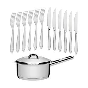 Muito importante: -- conferir produtos no ato do recebimento. Não aceitar produtos com embalagem violada amassado, rasgado, aberto, quebrado, etc , a recusa deve ser feita no ato. Conjunto de 1 panela solar 16cm 1,4l com 36 talheres de mesa laguna tramontina Componentes do kit: 18 un - 63906180 faca para churrasco laguna em aço inox - tramontina 18 un - 63906020 garfo de mesa laguna em aço inox - tramontina 1 un - 62501160 panela em aço inox linha solar fundo triplo 16 cm 1,4l pit7 - tramontina --- faca para churrasco laguna em aço inox - tramontina 63906180 : 90 dias para vícios ou defeitos de fabricação - ideal para restaurante, lancheria, paderia, linha doméstica, residência, gourmet - acabamento em brilho, com detalhes no cabo - própria para uso diário combina com qualquer ambiente - pode ser lavada diariamente na máquina de lavar louças - peso líquido: 0,043 kg - peso bruto: 0,045 kg - dimensões embalagem : 0,8cm a x 2cm l x 23cm p - dimensões produto : 0,3cm a x 1,8cm l x 21cm p - espessura: 3,0 mm --- garfo de mesa laguna em aço inox - tramontina 63906020 : 90 dias para vícios ou defeitos de fabricação - ideal para restaurante, lancheria, paderia, linha doméstica, residência, gourmet - próprio para uso diário combina com qualquer ambiente - pode ser lavado diariamente na máquina de lavar louças - peso líquido: 0,032 kg - peso bruto: 0,035 kg - dimensões embalagem: 2cm a x 2,5cm l x 20cm p - dimensões produto : 1,9cm a x 2,3cm l x 19,3cm p - espessura: 1,6 mm --- panela em aço inox linha solar fundo triplo 16 cm 1,4l pit7 tramontina 62501160 : 90 dias para vícios ou defeitos de fabricação - pode ir ao forno em temperatura máxima de 260c, podendo haver mudança na coloração. - produto com certificação compulsória certificada pela ocp 0104- pcn do brasil, registro 001470/2018, conforme portaria inmetro 419/2012. Especificações técnicas: - altura sem tampa: 8cm - altura com tampa: 11cm - diâmetro externo: 18cm - diâmetro interno: 16cm - altura interna: 7cm - largura total: 33cm