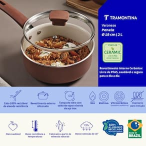 Com a panela Tramontina Veronese em alumínio reciclado com revestimento interno cerâmico e externo siliconado argila 18 centímetros 2 litros, o preparo diário das refeições fica mais leve e eficiente. A base em alumínio reciclado garante aquecimento uniforme, contribuindo para cozimento equilibrado. O revestimento cerâmico interno oferece praticidade durante o cozimento. Com design moderno e funcional, a peça se destaca pela versatilidade e facilidade de uso em diferentes receitas.