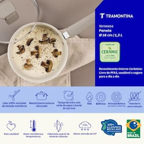 Com a Panela Tramontina Veronese em alumínio reciclado com revestimento interno cerâmico e externo siliconado bege mineral 16 centímetros 1,3 litros, você conta com leveza e bom desempenho para o preparo das refeições do dia a dia. A estrutura em alumínio reciclado garante aquecimento uniforme, contribuindo para resultados mais eficientes. O revestimento cerâmico interno oferece praticidade durante o cozimento. O acabamento siliconado em bege mineral valoriza o visual da peça, resultando em um item funcional e bem integrado à cozinha.