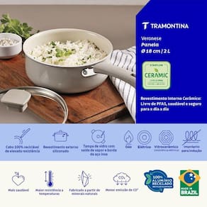 Panela Tramontina Veronese Alumínio E Cerâmica Bege 18cm 2 L Com a panela Tramontina Veronese em alumínio reciclado com revestimento interno cerâmico e externo siliconado bege mineral 18 centímetros 2 litros, você tem uma peça leve e com desempenho adequado para o uso cotidiano. A estrutura em alumínio reciclado assegura aquecimento uniforme, favorecendo preparos mais eficientes. O revestimento cerâmico interno oferece praticidade durante o cozimento. O acabamento siliconado em bege mineral complementa o visual da panela, trazendo um estilo atual que se integra bem à cozinha. Capacidade - 2 L Tipo de produto - Panelas Tampa - Vidro Tampa(s) com saída de de vapor - Sim Revestimento Interno - Cerâmico Inclui tampa - Sim Podem ser utilizadas nos fogões - gás, elétrico, vitrocerâmico - resistência elétrica. Adequado para fogão de indução - Não Principais Características do Produto 0 - Corpo de alumínio reciclado com revestimento interno cerâmico. Revestimento externo siliconado. Principais Características do Produto 1 - Tampa de vidro temperado com saída de vapor e borda de aço inox. Pegador de nylon 100% reciclável. Principais Características do Produto 2 - Alças 100% recicláveis de alta resistência. Fonte de energia - Gás elétrico Origem - Nacional NBM/NCM - 76151000 Comprimento da embalagem do vendor - 36 cm Largura da embalagem do vendor - 21 cm Altura da embalagem do vendor - 14 cm Peso da embalagem do vendor - 1000 g Regulamentações de produtos perigosos - Não aplicável É frágil? - Não Baterias são necessárias? - Não Número de caixas - 1 Tempo de Garantia (Meses) - 3 Linha ou Coleção - Veronese Modelo - 28624318 Comprimento - 34,9 cm Largura - 19,3 cm Altura - 12,7 cm Dimensões do item C x L x A - 34,9x19,3x12,7 cm Material - Alumínio Inclui manual de montagem - Não Componentes incluídos - Tampa Cor - Bege Mais informações - Corpo de alumínio reciclado com revestimento interno cerâmico.Revestimento externo siliconado.Alças 100% recicláveis de alta resistência.Tampa de vidro temperado com saída de vapor e borda de aço inox.Pegador de nylon 100% reciclável.Livre de PFAS, saudável e seguro para o dia a dia. Quantidade de itens - 1 Instruções de cuidados com o produto - Seguro para lava-louças Certificação - Não aplicável Garantia do fabricante - 3 meses para vícios ou defeitos de fabricação Peso do item - 0.8 kg Exige montagem - Não Fabricante - Tramontina Marca - Tramontina EAN - 7891112356658