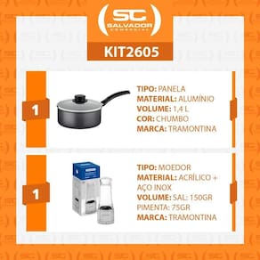 MUITO IMPORTANTE:CONFERIR PRODUTOS NO ATO DO RECEBIMENTO. NÃO ACEITAR PRODUTOS COM EMBALAGEM VIOLADA (AMASSADO, RASGADO, ABERTO, QUEBRADO, ETC), A RECUSA DEVE SER FEITA NO ATO Componentes do Kit:1 - Panela Turim Alumínio Antiaderente Chumbo 16cm 1,4L PTC3 - Tramontina1 - Moedor Saleiro Sal ou Pimenta Realce em Acrílico e Inox com Moinho em Cerâmica - Tramontina Panela Turim Alumínio Antiaderente 18cm 1,4l Ptc + Moedor de Sal e Pimenta Grande - Tramontina Eleve sua experiência culinária com a Panela Turim em Alumínio Antiaderente Tramontina e o Moedor de Sal e Pimenta, um conjunto ideal para quem busca praticidade e excelência. Perfeita para uso doméstico, esta panela otimiza o preparo de suas refeições diárias. Seu revestimento antiaderente impede que os alimentos grudem, facilitando o cozimento e a limpeza. Com sua capacidade de 1,4 litros, a panela é perfeita para preparar pequenas porções com agilidade e eficiência. A panela, com sua espessura de 1,2mm, garante um aquecimento rápido e uniforme. O conjunto acompanha um moedor grande de sal e pimenta, que traz um toque de elegância e funcionalidade à sua bancada. Construído em alumínio e com revestimento interno e externo antiaderente Starflon T1, este kit oferece durabilidade e resistência para o uso contínuo. A tampa de vidro temperado e o cabo de baquelite proporcionam segurança e praticidade. Não perca a oportunidade de equipar sua cozinha com o melhor. Adquira agora o seu conjunto e prepare pratos incríveis com mais facilidade! Especificações Moedor:- Prático e elegante- Possui engrenagens de alta resistência, proporcionando maior durabilidade- Com ajuste de moagem, possui regulador de tamanho de grão, para que seja ajustado conforme seu gosto- Garantindo higiene e beleza- Material: acrílico + aço inox- Moedores de cerâmica- Compartimento de acrílico- Tampa de acrílico- Capacidade:- Sal = 150 G- Pimenta = 75 G- Medidas Produto: 16,7cm A x 6,5cm diâmetro Especificações Panela:- Capacidade: 1,4L;- Alumínio com 1,2mm de espessura;- Revestimento anti-aderente;- Altura com tampa e cabo: 13,9cm;- Altura somente com tampa: 14,4cm;- Diâmetro: 16cm;- Comprimento total: 31,9cm;- Não utilizar em temperaturas superiores à 260C. Perguntas Frequentes:- Qual a capacidade da panela?A panela Turim tem capacidade para 1,4 litros, ideal para preparar porções menores. - Qual a principal característica do revestimento da panela?A panela possui revestimento antiaderente Starflon T1, que impede que os alimentos grudem. - É seguro usar a panela em altas temperaturas?Sim, a panela pode ser usada, mas não é recomendado exceder a temperatura de 260C. Cor: Cinza | É kit de fábrica: Não | Quantidade de Peças: 2 | Materiais: Alumínio | Adequado para fogão de indução: Não | Com revestimento antiaderente: Sim