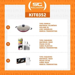 Componentes do kit- 1 panela wok alumínio 36 cm paris vermelho - tramontina- 1 faqueiro 30pç - tramontina- 1 faqueiro inox 24pç - tramontinapanela 36cm wok paris aluminio antiaderente tramontina 20545/736descrição ficha técnica:produzida em alumínio com revestimento interno antiaderente starflon t1tampa em vidro tamperado com saída de vapor e borda de aço inox.Alças em aço inox com proteção de baquelite antitérmico e pegador de nylon.- modelo wok paris 36cm.- corpo em alumínio reforçado 1,8mm.- revestimento antiaderente starflon.- maior resistência a desgaste por fricção, raspagem.- pode cozinhar fogão a gás, elétrico e também vitrocerâmico.- fácil manuseio e limpeza.- capacidade 6 l.- 1 unidade por embalagem.- pode lavar em máquina.Peso líquido: 1,8 kgpeso bruto: 1,95 kgmedida externa: 15,5cm a x 46,4cm l 36,4cm área cuba . - mais detalhes, na foto do anuncio . Faqueiro facas talheres ipanema 30pç tramontina 23398/088faca e garfo.Descrição ficha técnica:modelo ipanema 30 peças.Cód. 23398/088 cor preta.Uso seguro e adequado:- antes da primeira utilização, lave bem as peças e seque-as.- produtos cortantes e perfurantes, tenha cuidado e mantenha sempre fora de alcance das crianças.- para maior durabilidade dos produtos, recomenda-se secar bem antes de guardar, mesmo após lavagem em máquinas.- para descarte dos produtos e embalagem, siga a orientação de reciclagem vigente.Conteúdo:6 facas lâmina 11,2cm - medida 21cm6 garfos de mesa. - medida 19cm6 colheres de mesa. - medida 19cm6 garfos para sobremesa. - medida 14cm6 colheres para chá. - medida 14cm- lâmina em aço inox, maior resistência a desgaste por fricção, raspagem.- fácil manuseio e limpeza sempre cuidando com navalha e pontas .- 30 pç por embalagem.Peso líquido: 0,95 kgpeso bruto: 1,05 kg faqueiro facas talheres buzios 24pç tramontina 23799/071faca e garfo.Descrição ficha técnica:modelo buzios 24 peças.Cód. 23799/071 inox.Uso seguro e adequado:- antes da primeira utilização, lave bem as peças e seque-as.- produtos cortantes e perfurantes, tenha cuidado e mantenha sempre fora de alcance das crianças.- para maior durabilidade dos produtos, recomenda-se secar bem antes de guardar, mesmo após lavagem em máquinas.- para descarte dos produtos e embalagem, siga a orientação de reciclagem vigente.Conteúdo:6 facas churrasco lâmina serrilhada 10,6cm - medida total 20,8cm6 garfos de mesa. - medida total 19cm6 colheres de mesa. - medida total 19cm6 colheres para chá. - medida total 13cm- lâmina em aço inox, maior resistência a desgaste por fricção, raspagem.- fácil manuseio e limpeza sempre cuidando com navalha e pontas .- 24 pç por embalagem.Peso líquido: 0,8 kgpeso bruto: 0,95 kg expecificação da embalagem do kit:peso bruto: 3,95kgmedida embalagem: 26cm alt x 45cm l x 38cm p.