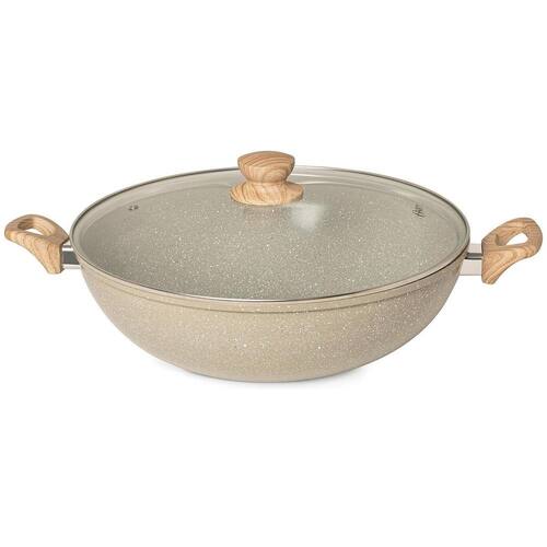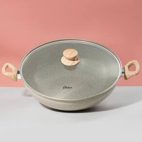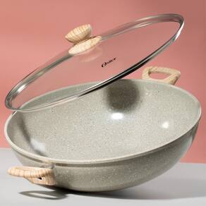 Versatilidade na cozinha: a frigideira wok de cor marmorizada cinza dust, oferecendo versatilidade para suas necessidades culinárias.