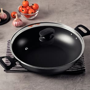 Prepare receitas incríveis e cheias de sabor, com o auxílio da wok Tramontina Loreto em alumínio com revestimento interno e externo em antiaderente Starflon Max 28 centímetros de diâmetro 3,3 litros.