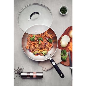 - Para preparar suas receitas com muito mais qualidade e estilo, conte com a Wok Tramontina Solar Silicone em aço inox com fundo triplo e a tampa de vidro 28 centímetros de diâmetro.