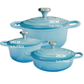 01un Panela com 20cm de diametro e 2,7litros01un Panela com 26cm de diametro e 3,4litros01un Panela com 28cm de diametro e 7,0litros02un Luva de silicone01un Pegador multiuso de silicone e inoxEstas Panelas são diferentes de tudo que voce ja viu, indispensáveis,não solta residuos nada gruda mesmo sem oleo ,é livre de PFOA, mantem o alimento quente por muito tempo e são leves de manusear podendo ser levadas do fogão à mesa de servir.