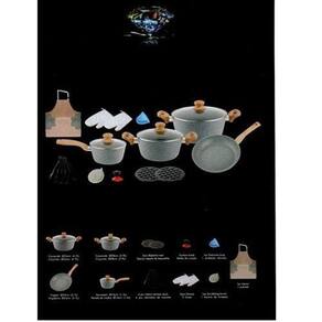 As panelas são compatíveis com diferentes tipos de fogão, como gás, elétrico, vitrocerâmico e indução, trazendo praticidade para o seu dia a dia. O jogo conta com uma caçarola de 24cm com capacidade de 4.7L, uma frigideira de 24cm com capacidade de 2.1L, uma panela de 16cm com capacidade de 1.6L, duas peças de baquelite, seis colheres de nylon, um botão de sucção, uma proteção de silicone, um par de luvas, uma esponja, um avental e uma panela de 20cm com capacidade de 2.9L. As tampas são feitas de vidro temperado e as alças possuem cabo de madeira anti calor.